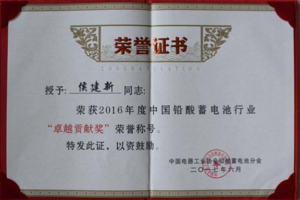 近期在中国电器工业协会铅酸蓄电池分会成立三十周年暨第八届三次会员大会上,我公司获得“2016年度中国铅酸蓄电池行业优秀配套企业”的荣誉称号,公司连续三年获此殊荣,我公司董事长侯建新同志荣获2016年度中国铅酸蓄电池行业“卓越贡献奖”荣誉称号。这是行业对我公司及公司领导的认可和褒奖,也是对我们的鼓励。