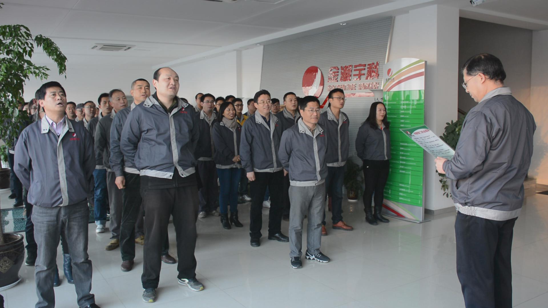 一日之计在于晨,自2017年1月9日起,金潮宇科蓄电池有限公司的晨间大早会活动正式拉开序幕,公司所有后勤人员在一楼大厅以部门为组列队参加,车间人员在车间内列队参加,首次大早会由公司顾问高伟负责主持,全体人员宣读企业精神、企业理念、企业质量方针、安全训条,练习礼貌用语,让蓄电池公司的每一天都在生机勃勃中拉开序幕。