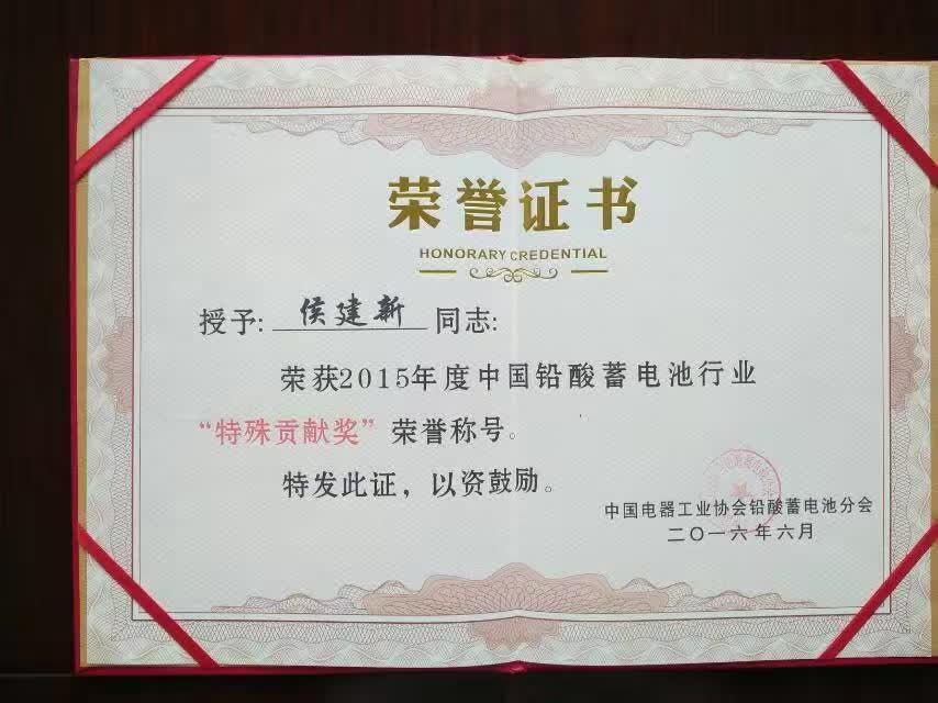 热烈庆祝公司再次被协会评为最佳配套企业,同时公司董事长侯建新被授于2015年度中国铅酸蓄电池行业“特殊贡献奖”荣誉称号。